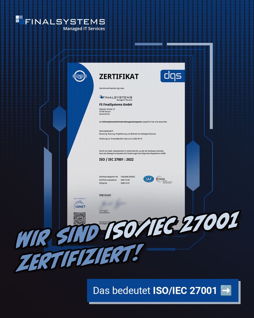 Am 28. November 2025 haben wir ein bedeutendes Kapitel in der Geschichte unseres Unternehmens aufgeschlagen: FINALSYSTEMS ist offiziell nach ISO/IEC 27001 zertifiziert – dem weltweit anerkannten Standard für Informationssicherheits-Managementsysteme (ISMS).